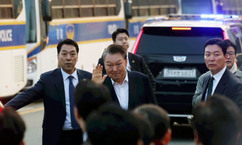 윤석열 대통령이 8일 오후 경기 의왕시 서울구치소 앞에서 지지자들에게 인사하고 있다. 윤 대통령 오른쪽은 김성훈 경호처 차장. 뉴시스