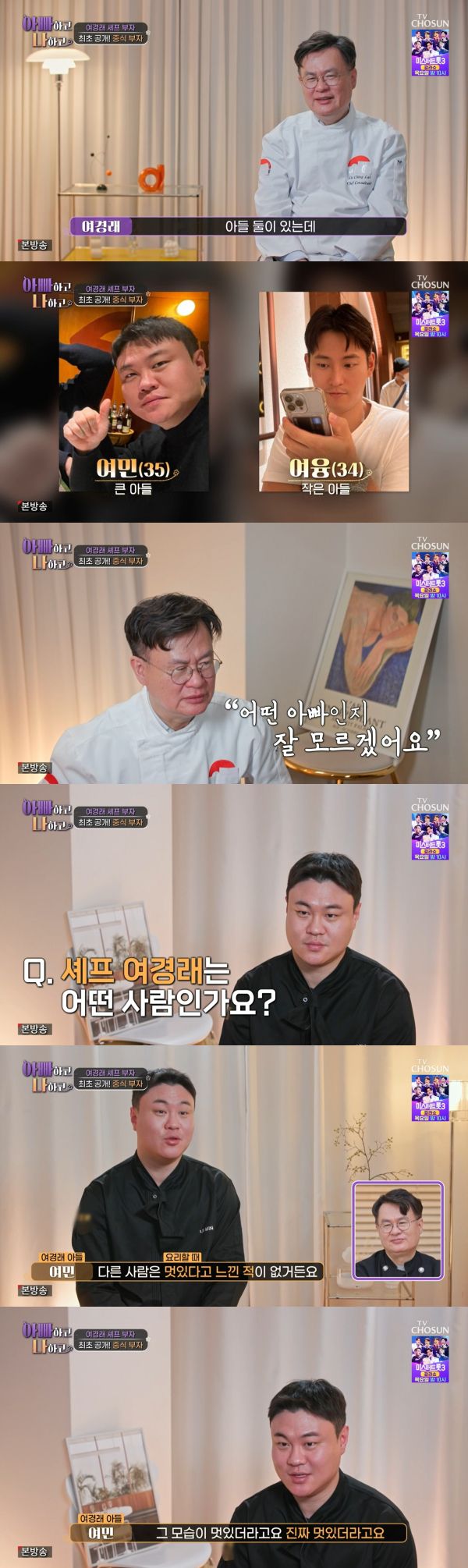 18일 방송된 TV조선 '아빠하고 나하고'에는 여경래 셰프와 그의 가게에서 부주방장을 맡고 있는 아들 여민이 출연했다.
