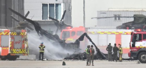 17일 오후 경기 양주시 광적면 석우리 소재 육군 항공대대에서 무인기와 착륙해 있던 헬기가 충돌하는 사고가 발생해 군 관계자들과 소방대원들이 진화 작업을 하고 있다. 뉴시스 |