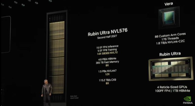 ‘베라 루빈’에서 눈에 띄는 부분은 HBM4e를 언급했다는 것. 이날 SK하이닉스가 샘플을 공급했다는 소식을 전하기도 했다. 무려 1TB 메모리가 제공된다. GPU 역시 두 개 다이에서 4개 다이로 보다 커진다.