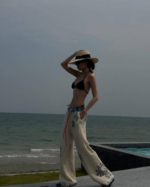 공개된 사진 속 손나은은 홀터넥 블랙 비키니 톱을 착용해 탄탄한 몸매를 뽐냈으며, 감각적인 패턴이 돋보이는 와이드 팬츠를 매치해 세련된 리조트룩을 완성했다.
