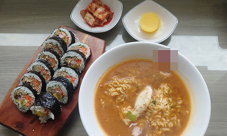 서울 용산구 한 분식점에서 주문한 라면과 김밥. 김경호 기자