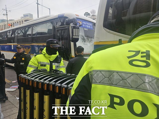 더불어민주당 의원들이 헌법재판소 앞에서 윤석열 대통령 파면 촉구 기자회견을 하던 중 윤 대통령 지지자들이 던진 계란에 맞았다. 경찰은 시위대 강제 해산에 나서는 한편, 전담팀을 꾸리고 수사에 착수했다. 사진은 경찰이 20일 오전 헌재 정문 맞은편 인도에 바리케이드를 설치하며 경비를 강화하는 모습. /이다빈 기자