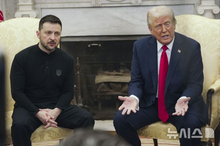 [워싱턴=AP/뉴시스]도널드 트럼프(오른쪽) 미국 대통령과 볼로디미르 젤렌스키 우크라이나 대통령 지난달 28일(현지 시간) 워싱턴 백악관 집무실에서 회담하고 있다. 2025.03.20.