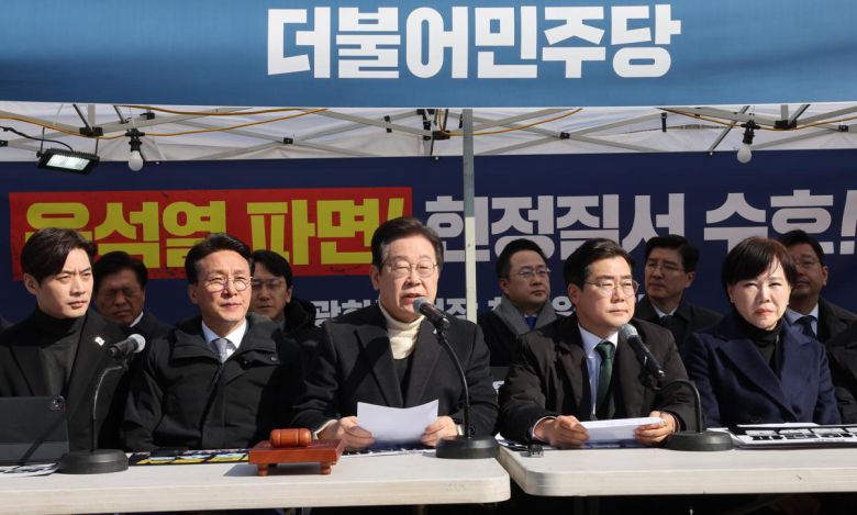 신동욱 수석대변인은 기자들과 만나 “헌법재판소 심사 과정이라든지 이 대표 본인 재판이 진행 중인 상황에 이런 표현을 쓰면 최 권한대행에 대한 겁박이기도 하지만 헌법재판관, 이 대표 재판 판사에게도 상당한 심리적 압박이 될 수 있다”고 말했다. 그러면서 “민주당이나 이 대표 본인 어떤 형태로든 입장 표명이 있어야 한다”고 말했다.