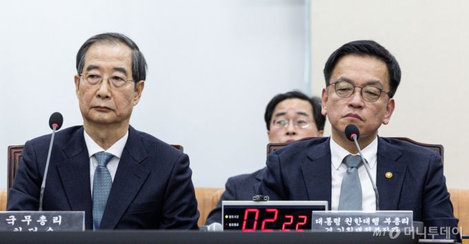 (서울=뉴스1) 이재명 기자 = 최상목 대통령 권한대행 부총리 겸 기획재정부 장관(오른쪽)과 한덕수 국무총리가 6일 오전 서울 여의도 국회에서 열린 윤석열 정부의 비상계엄 선포를 통한 내란 혐의 진상규명 국정조사특별위원회 제3차 청문회에 출석해 있다. 2025.2.6/뉴스1 Copyright (C) 뉴스1. All rights reserved. 무단 전재 및 재배포, AI학습 이용 금지. /사진=(서울=뉴스1) 이재명 기자 |