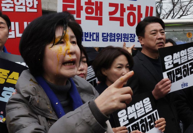 계란 맞은 민주당 백혜련 백혜련 더불어민주당 의원이 20일 서울 종로구 헌법재판소 앞에서 윤석열 대통령 신속 파면 촉구 기자회견을 하던 중 윤 대통령 지지자로 추정되는 사람이  던진 계란에 얼굴을 맞은 뒤 항의하고 있다.  연합뉴스