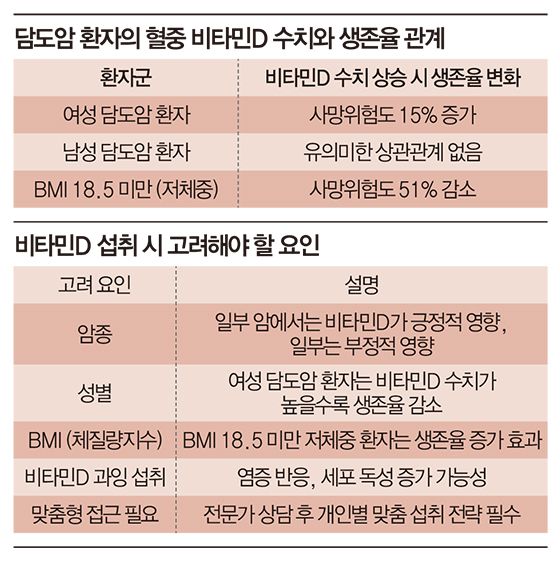 유창훈 서울아산병원 종양내과 교수는 “이번 연구는 진행성 담도암 환자의 혈중 비타민D 수치가 성별·BMI 등 환자의 신체 특성에 따라 생존율에 다르게 작용한다는 사실을 최초로 제시했다”라며 “앞으로 더 많은 후속 연구를 통해 담도암에서 비타민D가 어떤 생물학적 과정을 거쳐 암세포에 관여하는지 규명하는 것이 중요하다”라고 말했다. 그는 또한 “비타민 주사를 맹신하는 암환자들이 적지 않은데, 무작정 고용량 비타민D를 맞기보다는 암종·성별·체중 상태 등을 종합해서 고려해 신중하게 접근해야 한다”라고 강조했다.실제로 건강한 일반인들에게도 비타민D의 적정 섭취는 중요하지만, 모든 사람이 같이 접근할 필요는 없다. 밤에 근무해 햇볕을 제대로 쬐지 못하거나, 피부색이 짙어 자외선 흡수가 원활치 않은 경우, 그리고 고령층이나 대기오염이 심한 지역에 거주해 일조량이 부족한 사람들에게는 비타민D 영양제가 필요하다. 계절적 요인에 따라 햇볕이 줄어드는 겨울철에는 야외활동이 현저히 줄어들기 때문에 더욱 신경을 써야 한다.