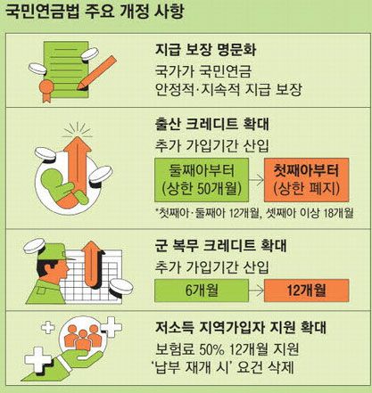 국가의 연금급여 지급 의무도 법에 명시된다. 현행 법에는 연금급여가 안정적·지속적으로 지급되도록 필요한 시책을 수립해야 한다고만 돼 있다. 개정안은 이를 연금급여의 안정적이고 지속적인 지급을 ‘보장’해야 한다고 명시했다.