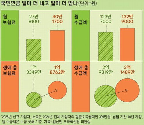 여야가 합의한 국민연금 개혁안은 보험료율과 소득대체율을 동시에 올렸다. 다만 생애 전체로 내는 돈이 더 늘어나도록 조정해 기금 고갈 시점을 9년 정도 늦췄다. 재정 안정성 제고와 소득보장 확대 사이에서 타협한 결과다.