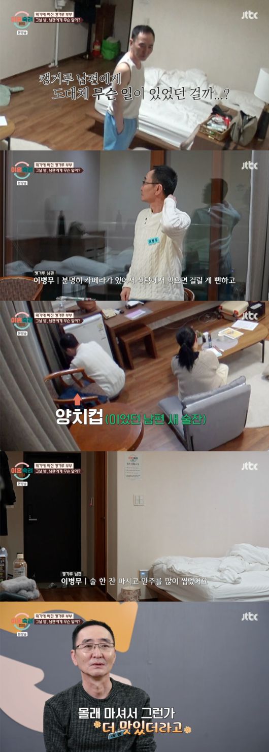 캠프 첫째 날 화장실 양치 컵으로 술을 마셨다는 캥거루 남편. 이후 남편은 금주를 결심했지만 술을 마시는 모습이 포착됐다. 남편은 도시락으로 나온 메뉴를 언급하며 “닭볶음탕을 좋아한다. 카메라가 있어서 (술을) 먹으면 걸리고”라고 밝히기도.