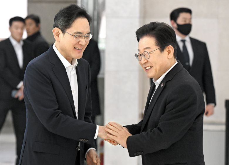 이재명 더불어민주당 대표는 20일 이재용 삼성전자 회장을 만나 “기업이 잘돼야 나라가 잘되고 삼성이 잘돼야 삼성에 투자한 사람들도 잘산다”고 했다. 조기 대선을 염두에 두고 친(親)기업과 경제 성장 메시지를 잇따라 내놓고 있는 이 대표는 이날 “(삼성이) 지금까지 해오신 것처럼 경제 성장의 견인차 역할을 잘해주시길 당부드린다”고 했다.