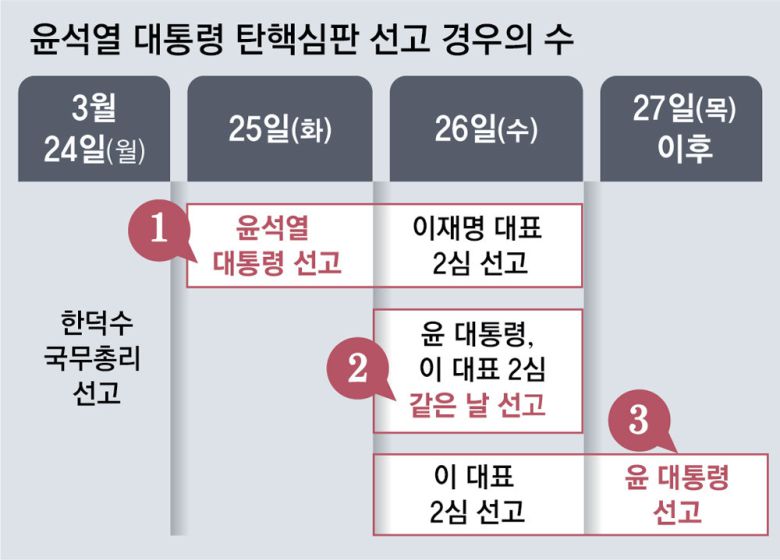 이 대표의 공직선거법 위반 사건 2심 선고가 26일로 예정된 가운데 비슷한 시기에 윤 대통령 선고가 이뤄질지도 주목된다. 헌재가 21일 선고기일을 공지한다면 윤 대통령 선고는 이 대표보다 하루 앞선 25일 내려질 수 있다. 그러나 헌재가 이틀 연속 선고한 전례는 1995년 12월 1번밖에 없어 가능성이 낮다는 분석이 제기된다.