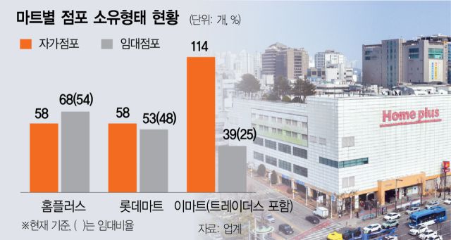 실제 이날 기준 홈플러스 전체 점포 중 임대점포 비중은 54%로 롯데마트(48%) 및 이마트(25%)보다 높다. 임대점포가 자가점포보다 많은 마트는 홈플러스가 유일하다. MBK가 인수할 당시인 2015년만 해도 홈플러스의 임대점포 비중은 37%에 불과했다. 최근 5년 새 문을 닫은 점포도 홈플러스가 16곳으로 이마트보다 두 배 많다.