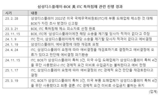 앞서 삼성디스플레이는 2022년 12월 미국 유통업체들이 특허를 침해한 OLED를 판매하고 있다며 ITC에 제소, 수입 금지를 요청했다. 특허 침해 품목은 스마트폰 리페어(수리)용 올레드 패널 등이다. 그러나 문제 삼은 제품들에 BOE 패널이 포함되면서 BOE가 자진해 피신청인이 됐고 논쟁이 이어져 왔다.