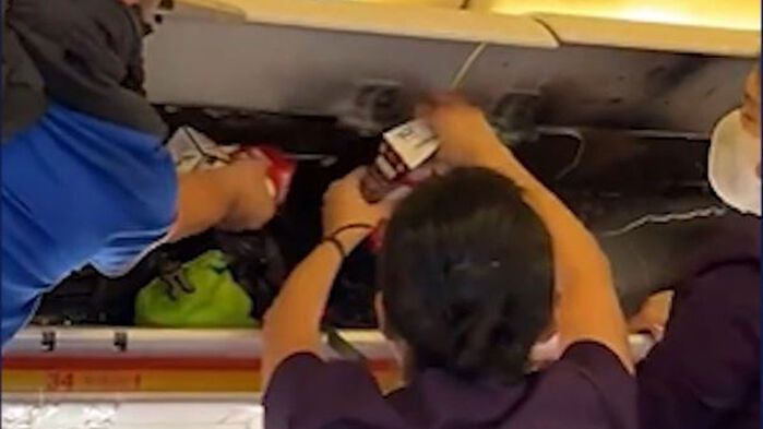 까맣게 그을린 기내 선반 수하물 보관함에 승객과 승무원들이 앞다퉈 생수와 주스 같은 음료를 들이붓습니다.