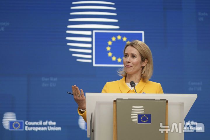 [브뤼셀=AP/뉴시스]유럽연합(EU)이 우크라이나 군사 지원을 늘리자는 데 뜻을 모았으나 헝가리 반대로 만장일치에는 실패했다. 우크라이나에 400억 유로(63조6000억여원)의 추가 군사 지원을 하자는 제안도 각국이 난색을 표해 무산됐다. 사진은 카야 칼라스 EU 외교안보 고위대표가 지난달 24일(현지시각) EU 외교장관회담 뒤 기자회견을 하는 모습. 2025.2.28. |