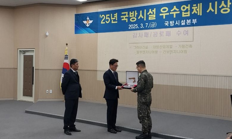 대방산업개발은 지난 7일 부대 다산관에서 열린 ‘2025년 국방시설 우수업체 시상식’ 에서 '우수 시공업체'로 선정돼 감사패를 수여받았다고 21일 밝혔다.