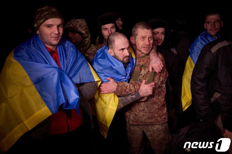 3일(현지시간) 우크라이나 내 러시아 점령지에서 우크라이나인 포로들이 포로 교환 후 국기를 두르고 석방 소식을 반기고 있다. 2024.01.03/ ⓒ 로이터=뉴스1 ⓒ News1 권진영 기자 |