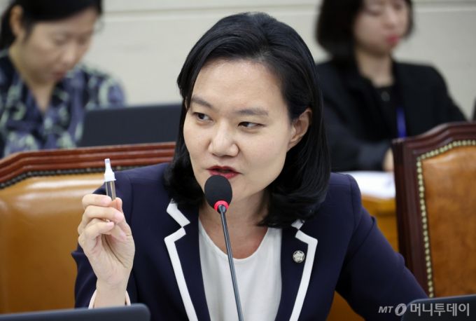 [서울=뉴시스] 조성우 기자 = 김남희 더불어민주당 의원이 10일 오전 서울 여의도 국회에서 열린 보건복지위원회의 식품의약품안전처 등에 대한 국정감사에서 오유경 식품의약품안전처장에게 질문을 하며 성장호르몬주사제를 보여주고 있다. 2024.10.10. xconfind@newsis.com /사진=조성우 |