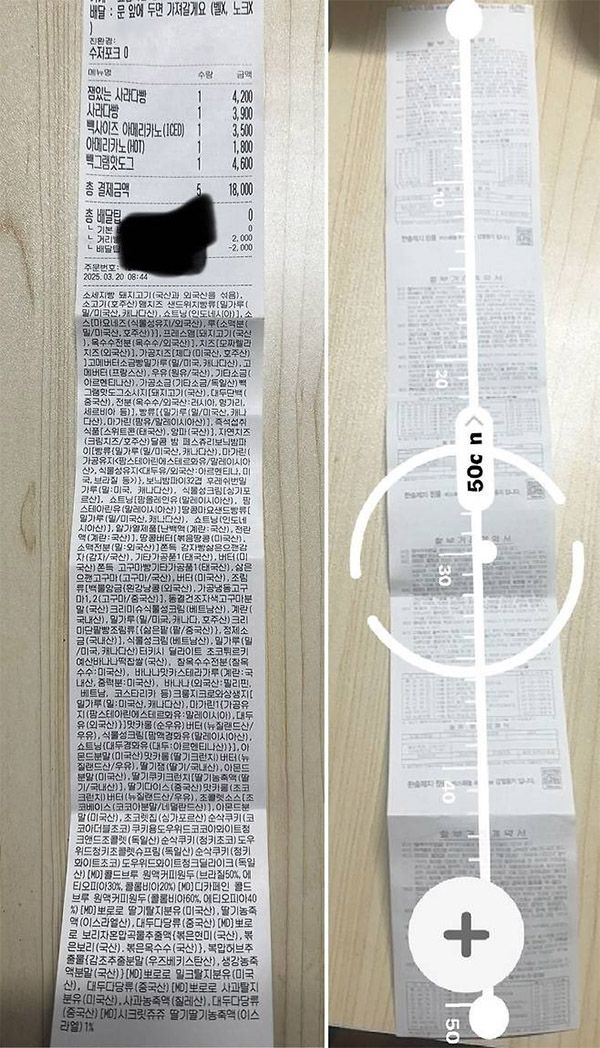 사진 속 영수증에는 빵과 커피, 핫도그 등의 주문 내역이 담긴 영수증 하단에 작은 글씨로 촘촘하게 수십 가지가 넘는 모든 재료의 원산지가 하나하나 표기돼 있다. 영수증 길이는 무려 50㎝를 넘었다.