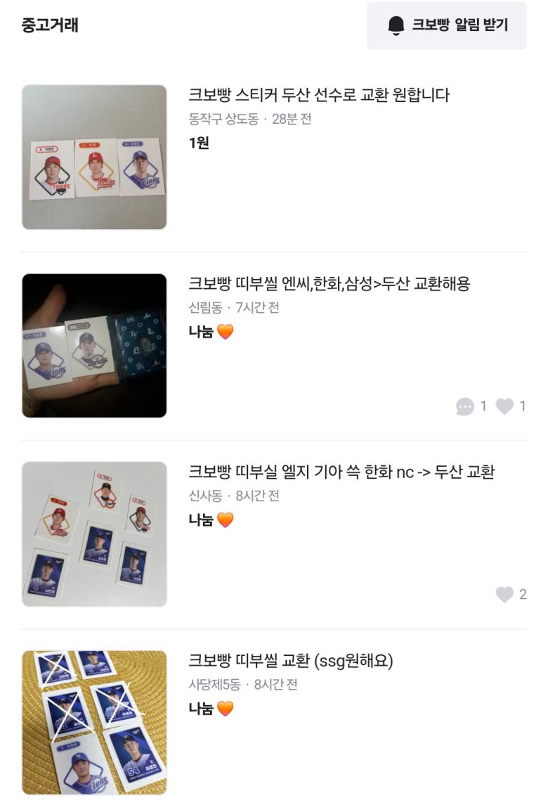결국 가챠(작은 기계에서 나는 금속음이나 시끄럽게 떠드는 소리로 일본의 의성어, 뽑기 기계 소리를 뜻함)에 실패한 이들은 약속한 듯이 당근에 당도했는데요. 희귀 띠부씰을 뽑으면 실제 현금으로 당근거래에 나섰던 ‘포켓몬빵’과 달리 “SSG이랑 교환하실 분”, “KIA 뽑았는데 한화 선수 원합니다” 등 나눔이 속출하고 있죠. 원하는 건 ‘우리 선수’니깐요. 선수들만큼이나 인기가 좋은 건 마스코트 띠부씰인데요. 귀여운 마스코트 띠부씰은 휴대전화나 각종 소지품에 붙여도 전혀 부끄럽지(?) 않다는 이유였습니다.
