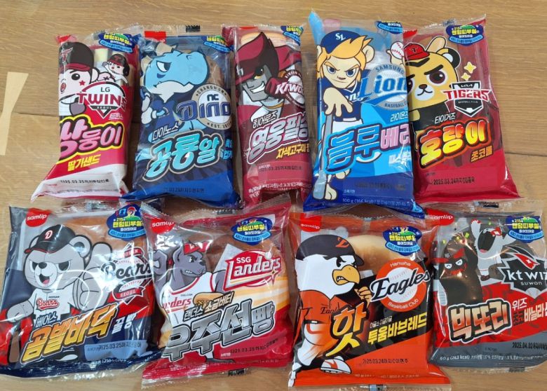 KIA 타이거즈 ‘타이거즈 호랑이 초코롤’, 삼성라이온즈 ‘라이온즈 블루베리 패스츄리’, LG 트윈스 ‘트윈스 쌍둥이 딸기샌드’, 두산 베어스 ‘베어스 곰발바닥 꿀빵’, kt 위즈 ‘위즈 빅또리 초코 바닐라 샌드’, SSG 랜더스 ‘랜더스 소금버터 우주선빵’, 한화 이글스 ‘이글스 이글이글 찻투움바 브레드’, NC 다이노스 ‘다이노스 공룡알 흑임자 컵케익’, 키움 히어로즈 ‘히어로즈 영웅필승 자색고구마팡’입니다.