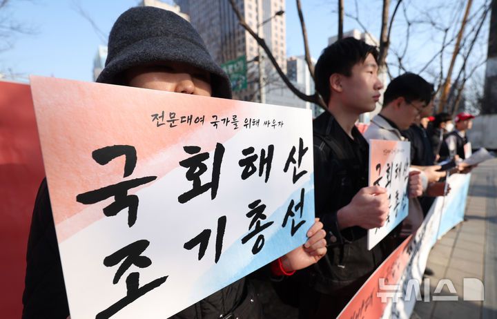 [서울=뉴시스] 추상철 기자 = 전국 전문대학생 연합이 21일 오후 서울 종로구 동화면세점 앞에서 '윤석열 대통령 탄핵 반대' 시국 선언 집회를 하고 있다. 2025.03.21. scchoo@newsis.com