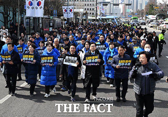 박찬대 원내대표 등 더불어민주당 의원과 당직자들이 17일 오전 서울 여의도 국회에서 출발해 광화문으로 이동하는 '내란 수괴 윤석열 파면 촉구 더불어민주당 국회의원 도보행진'에 참여한 모습. /배정한 기자 |