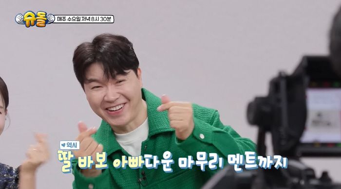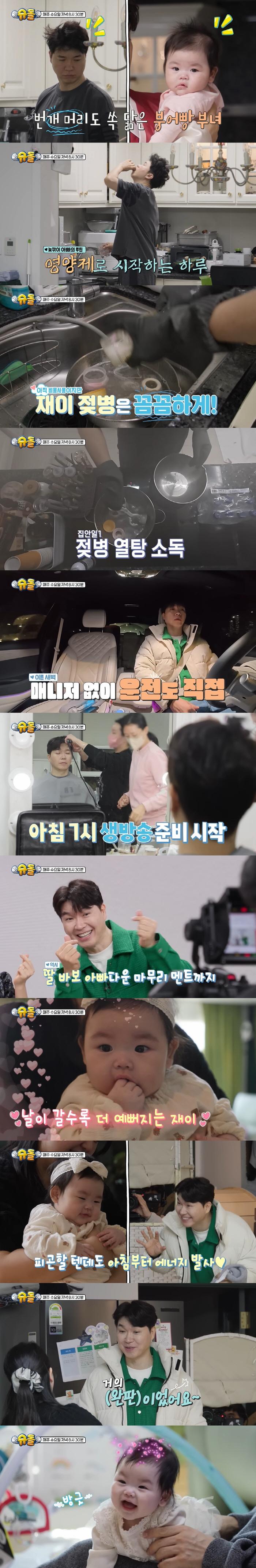 오전 9시. 생방송 끝내자마자 칼같이 귀가한 박수홍은 피곤할 텐데도 재이를 보자마자 "왜 이렇게 예쁘냐"며 에너지를 발사하며 함박웃음을 터트렸다. 재이는 윙크로 반가움을 드러냈다. 박수홍은 "어땠냐"는 아내의 질문에 "거의 완판이었다"며 웃었다.