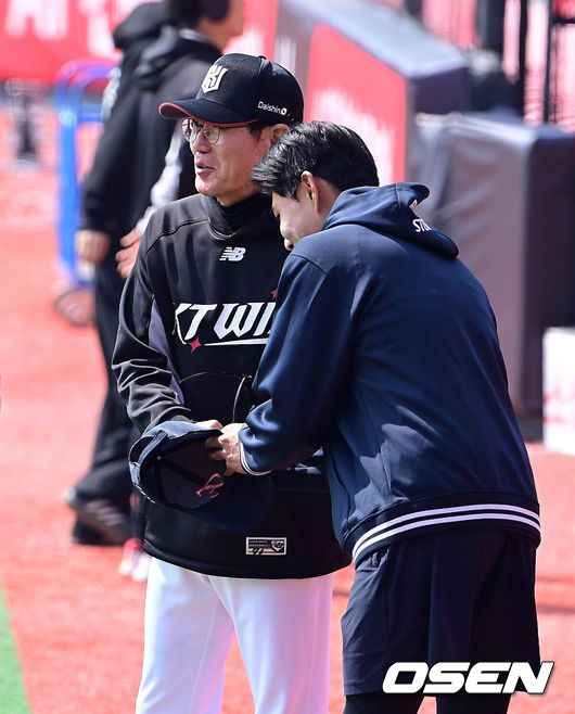 [OSEN=수원, 박준형 기자] 22일 수원KT위즈파크에서 ‘2025 신한 SOL BANK KBO리그’ KT 위즈와 한화 이글스의 개막경기가 진행됐다.이날 홈팀 KT는 헤이수스를, 어웨이팀 한화는 폰세를 선발투수로 내세웠다. 경기 앞두고 한화로 이적한 심우준이 이강철 감독에게 인사를 하고 있다. 2025.03.22 / soul1014@osen.co.kr