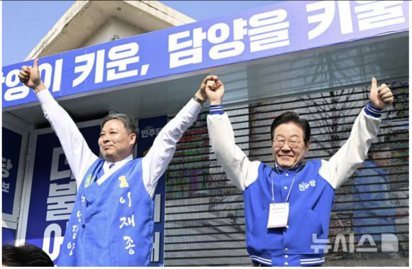 이재명 더불어민주당 대표가 4·2 전남 담양군수 재선거에 나선 이재종 민주당 후보 지원 유세에 나섰다.