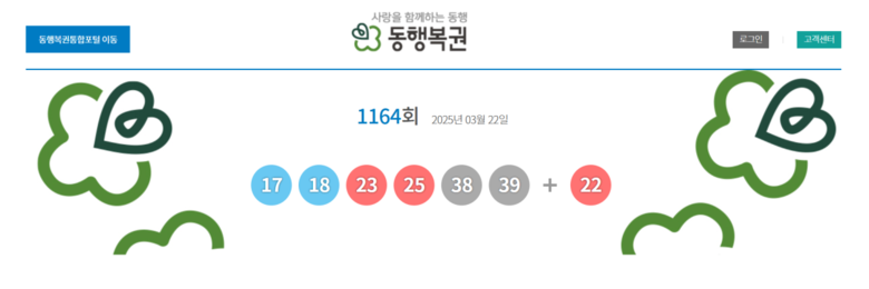 로또복권 운영사 동행복권은 제1164회 로또복권 추첨에서 '17, 18, 23, 25, 38, 39'가 1등 당첨번호로 뽑혔다고 22일 밝혔다.
