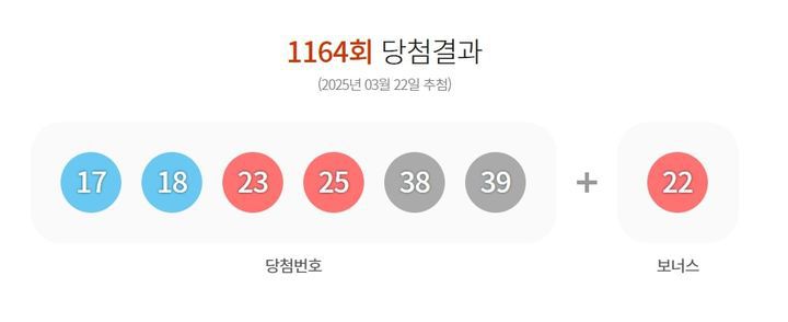 [서울=뉴시스]이다솜 기자 = 22일 제1164회 동행복권 로또 추첨 결과 '17, 18, 23, 25, 38, 39''가 1등 당첨 번호로 결정됐다. 2등 보너스 번호는 '22'다.