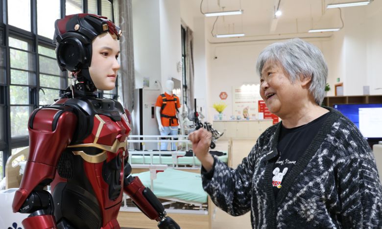 한 노인이 지난 3일 중국 남부 광둥성 선전의 요양원에서 휴머노이드 로봇 ‘샤란’을 살펴보고 있다. 선전=신화연합뉴스