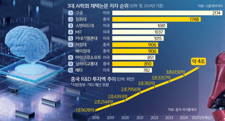 중국은 AI 국제 논문 등재 규모에서도 미국과 격차를 크게 줄이고 있다. 일본 니혼게이자이신문은 “지난해 세계 3대 AI학회에 채택된 논문을 분석한 결과 중국이 등재 저자 수가 많은 상위 10개 기관 중 4곳으로, 미국(6곳)을 바짝 추격했다”고 보도했다.