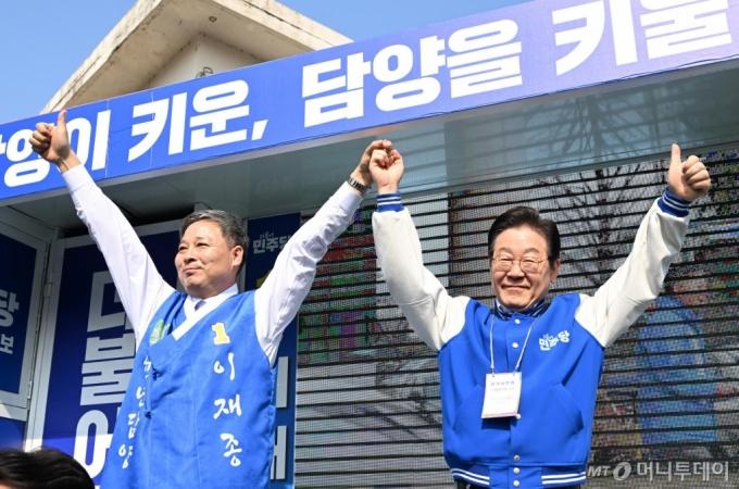 이 대표는 22일 오전 전남 담양군 담양중앙공원에서 열린 이재종 전남 담양군수 민주당 후보 집중유세에 나섰다. 이 후보는 4·2 전남 담양군수 재선거에 나선다. 이 후보는 정철원 조국혁신당 후보와 맞붙는다.