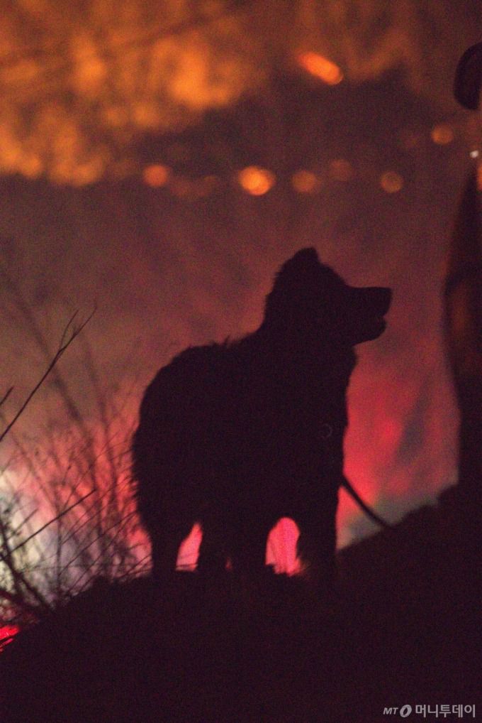 (의성=뉴스1) 신성훈 기자 = 22일 오후 10시쯤 의성 대형산불로 집을 잃은 강아지가 타오르는 산을 바라보고 있다. 2025.3.22/뉴스1 Copyright (C) 뉴스1. All rights reserved. 무단 전재 및 재배포, AI학습 이용 금지. /사진=(의성=뉴스1) 신성훈 기자 |