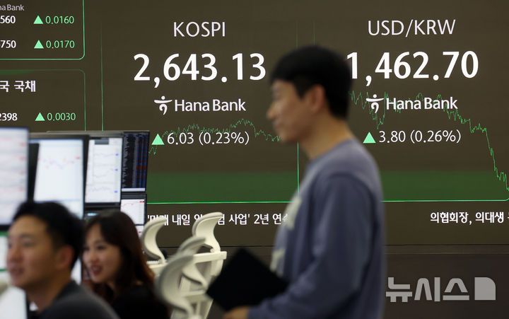 [서울=뉴시스] 홍효식 기자 = 코스피가 전 거래일(2637.10)보다 6.03포인트(0.23%) 오른 2643.13에 마감한 21일 오후 서울 중구 하나은행 딜링룸 전광판에 지수가 표시되고 있다.코스닥 지수는 전 거래일(725.15)보다 5.74포인트(0.79%) 하락한 719.41에 거래를 종료했다. 서울 외환시장에서 원·달러 환율은 전 거래일(1458.9원)보다 3.8원 오른 1462.7원에 주간 거래를 마감했다. 2025.03.21. yesphoto@newsis.com |
