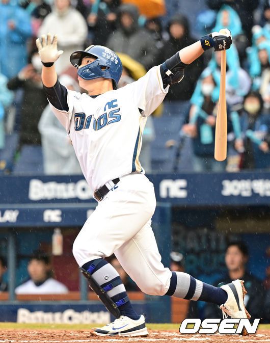 [OSEN=창원, 김성락 기자] 김경문 감독이 이끄는 프로야구 한화 이글스가 시범경기 4연승을 질주했다.한화는 16일 창원NC파크에서 열린 NC 다이노스와의 원정 경기에서 7회 5-3강우 콜드게임 승리를 장식했다.7회말 2사 2루 NC 신용석이 추격의 2점 홈런을 날리고 있다. 2025.03.16 / ksl0919@osen.co.kr