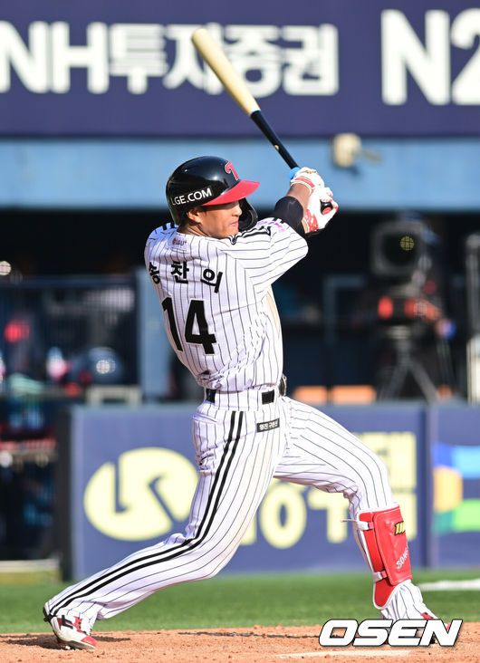 [OSEN=잠실, 김성락 기자] 22일 서울 잠실야구장에서 2025 신한 SOL Bank KBO리그 LG 트윈스와 롯데 자이언츠의 개막전이 열렸다.홈팀인 LG 트윈스는 새 외인 치리노스를 선발로, 원정팀 롯데 자이언츠는 반즈를 선발로 내세웠다.8회말 무사 엘지 송찬의가 안타를 날리고 있다. 2025.03.22 / ksl0919@osen.co.kr |