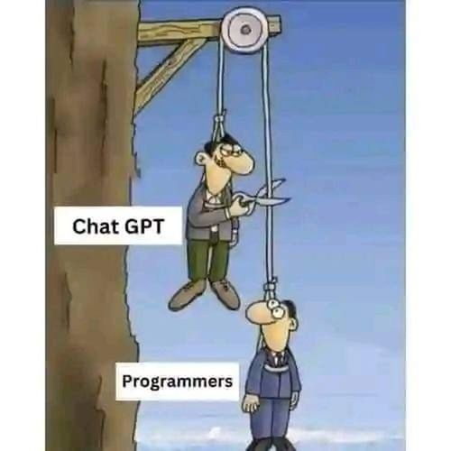 줄을 끊으면 프로그래머가 떨어지는 것처럼 보이지만, AI인 챗GPT 역시 홀로 절벽에 매달려 있을 수 없게 된다. 둘은 운명을 함께 하는 관계다.