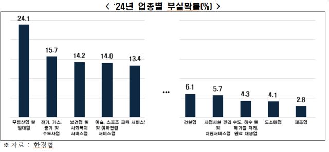 업종별로 부실확률을 살펴보면 부동산·임대업이 24.1%로 가장 높았고, 전기·가스·증기·수도사업(15.7%), 보건·사회복지서비스업(14.2%), 예술·스포츠·여가서비스업(14.0%)이었다. 반면 제조업이 2.8%로 가장 낮았고, 도소매업(4.1%), 수도·하수·폐기물처리·원료재생업(4.3%), 사업시설관리·지원서비스업(5.7%) 등의 부실확률이 상대적으로낮았다.