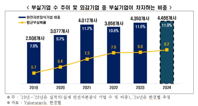 한국경제인협회가 23일 발표한 '기업부실예측분석을 통한 2024년 부실기업 진단'에 따르면 외부감사를 받아야 하는 외감기업(금융업 제외) 3만7510곳 중 4466곳(11.9%)이 완전자본잠식 상태에 놓인 것으로 분석됐다.
