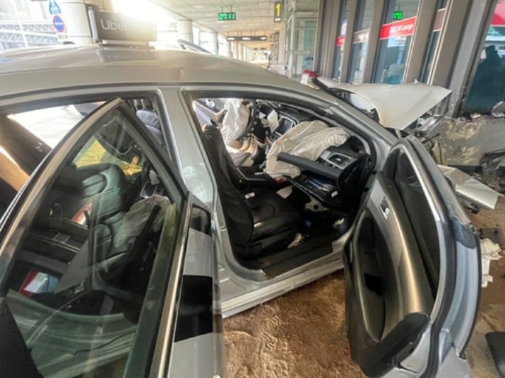 23일 부산경찰청 등에 따르면 이날 오전 6시 30분쯤, 부산 김해국제공항 앞 도로에서 승객을 태운 택시가 갑자기 인도 쪽으로 돌진했다. 차량은 기둥과 청사 외벽을 잇따라 들이받고 멈춰섰다.