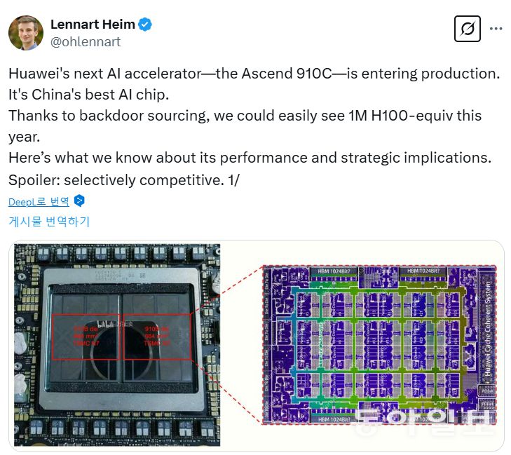 “화웨이의 다음 AI 가속기, 어센드910C가 양산에 들어갔다(entering production). 이건 중국 최고의 AI 칩이다.”