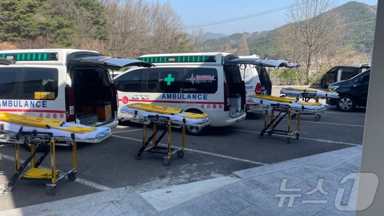 23일 오전 산청 산불로 숨진 30대 공무원과 산불진화대원 3명의 시신이 안치된 경남 산청군 산청장례식장 앞에 시신을 운구하기 위한 구급차들이 대기하고 있다.2025.3.23/뉴스1 강정태 기자