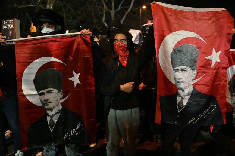 튀르키예 이스탄불에서 22일 반(反)정부 시위에 나선 청년이 ‘건국의 아버지’로 불리는 무스타파 케말 아타투르크의 얼굴이 그려진 튀르키예 국기를 든 모습. 튀르키예 검찰이 레제프 타이이프 에르도안의 최대 정적(政敵)으로 꼽히는 에크렘 이마모을루 이스탄불 시장을 체포하자 시위가 전국으로 번지고 있다. /AFP 연합뉴스 |