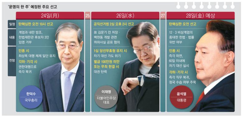 24일 오전 10시에는 한덕수 국무총리에 대한 헌법재판소의 탄핵심판 선고가 있다. 26일 오후 2시에는 이재명 더불어민주당 대표의 2심 판결이 기다린다. 이어 28일로 예상되는 윤석열 대통령 탄핵심판 결과까지 정치인 개개인의 운명뿐 아니라 국가의 명운을 좌우할 초대형 이벤트다.