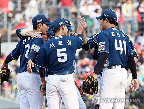 (광주=연합뉴스) 조남수 기자 = 23일 광주기아챔피언스필드에서 열린 프로야구 NC 다이노스와 KIA 타이거즈의 경기. NC 선수들이 5-4 승리를 거두고 세리머니 하고 있다. 2025.3.23